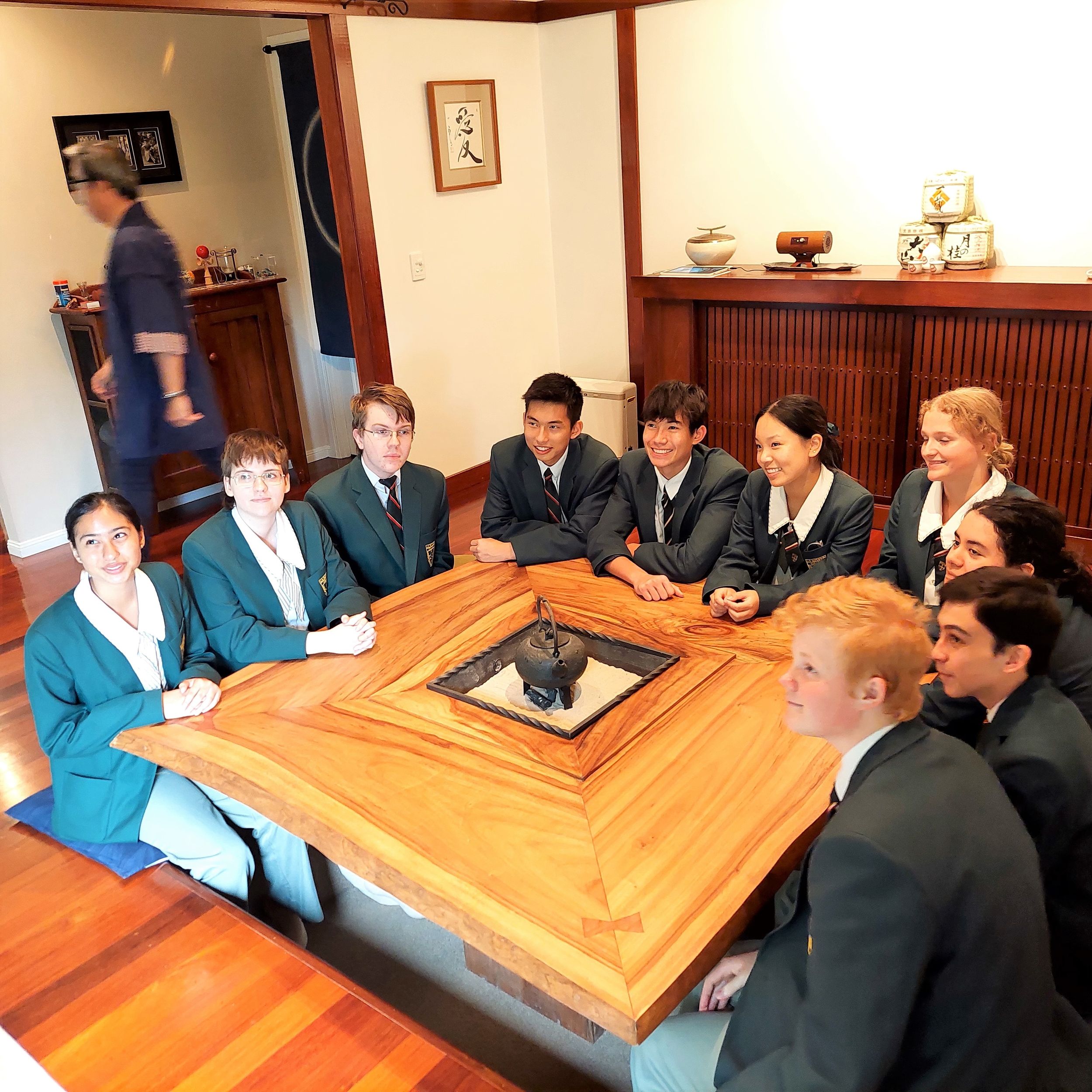 Sliding shoji screen doors welcomed us as we walked through ‘Yumeji’, the Japanese style retreat on Mount Tamborine on Tuesday. The students in Year 10 Japanese are studying a unit called 'My World' where they learn to understand the daily life of a Japanese teen and learn to speak about their daily life in Australia. The Yonezawa family welcomed us to their Japanese accommodation and explained to us the tatami mat flooring, the futon bedding on the floor, the chabudai tea table, the tokonoma alcove for artwork, the Japanese talisman and ornaments on show as well the outdoor bath. The students were treated to Japanese snacks for morning tea while sitting on zabuton cushions.