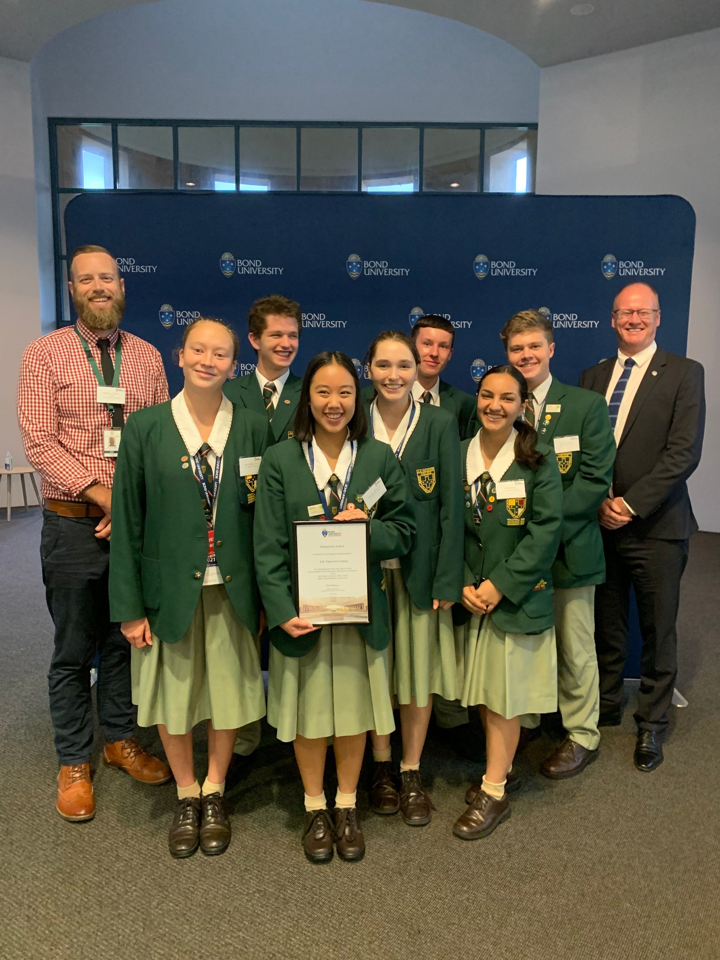 The 2021 conference of the Bond University High School Model United Nations (BUHMUN) at Bond University was attended by a delegation of seven A.B. Paterson College students from 11-12 May. Maria Nadezhdina, Bita Mahani, Elizabeth Roberts, Charley Ellwood, Connor O’Neill, Alexander Roberts and Angelina Inthavong were awarded a Best Delegation Award for their diplomacy and negotiation skills during the conference.