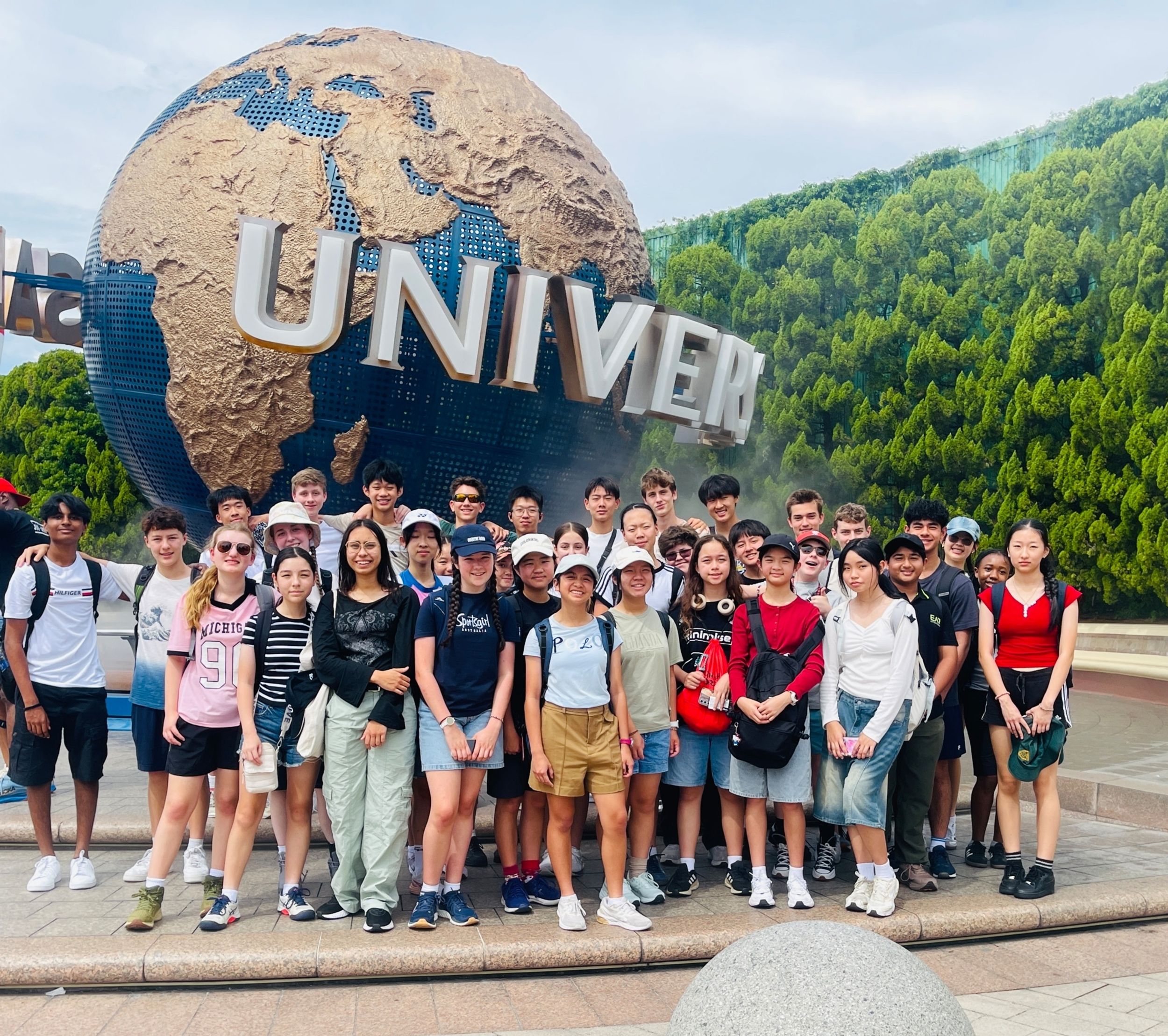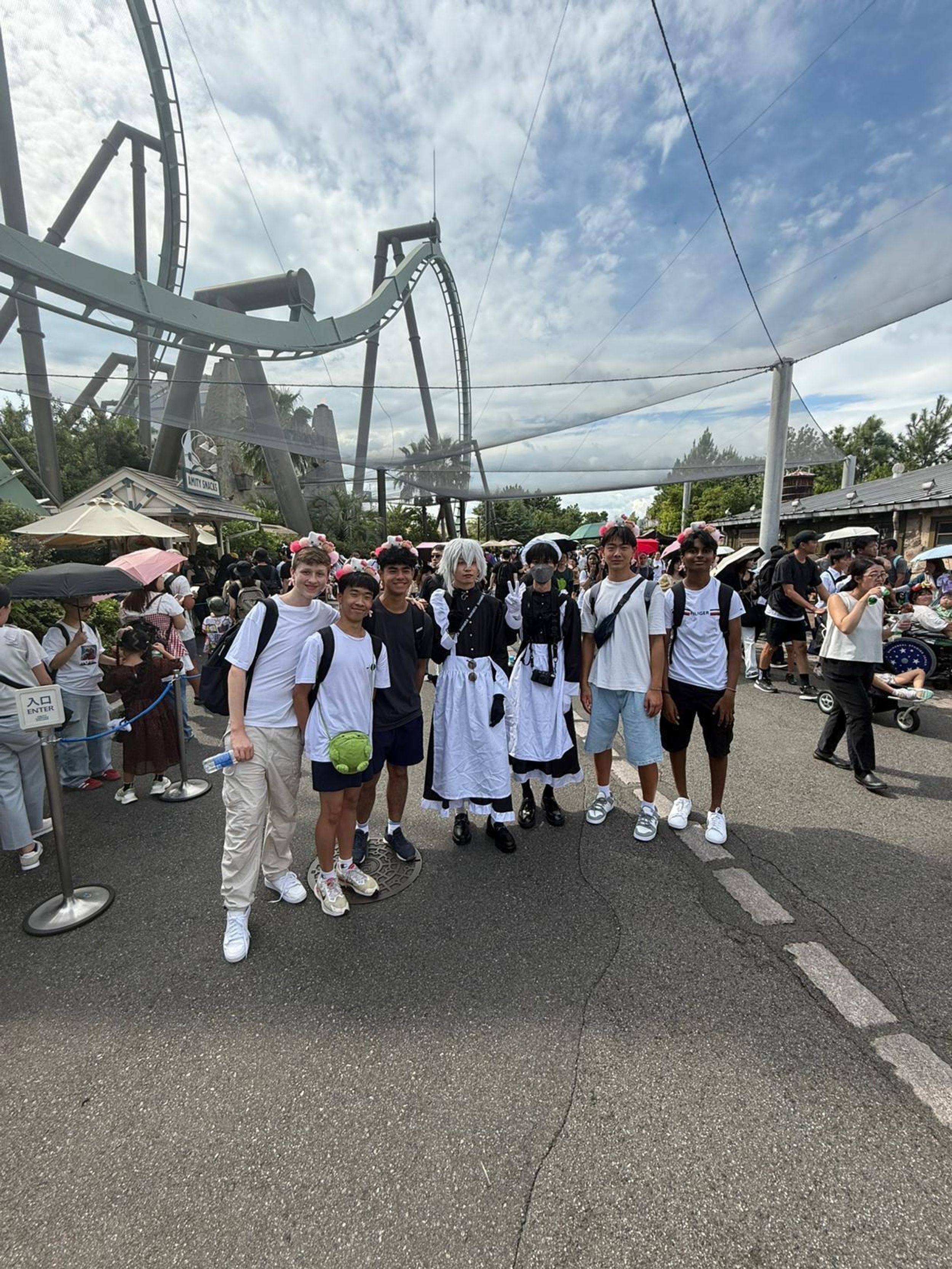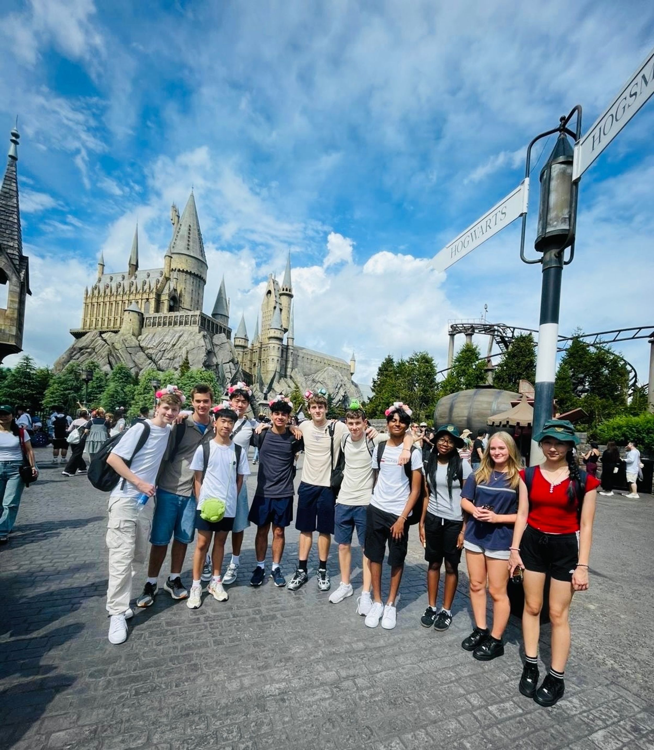 This morning we arrived at Universal Studios Japan to the pounding beat of Lady Gaga’s brand-new track “The Dead Dance”, perfectly setting the spooky Halloween mood for our much-anticipated day. All through the park we were met with cheerful “Happy Halloween!” greetings, and it wasn’t long before nearly everyone was sporting fun character headwear purchased along the way, Mario caps, Pokémon hats, Kitty-chan (Hello Kitty) bows, and roaring dinosaur heads that quickly became the most popular accessories of the day. Everywhere we went felt like one giant costume party. Excitement was high from the very first step inside, and it was game-on straight away as students launched into the day’s special challenge.