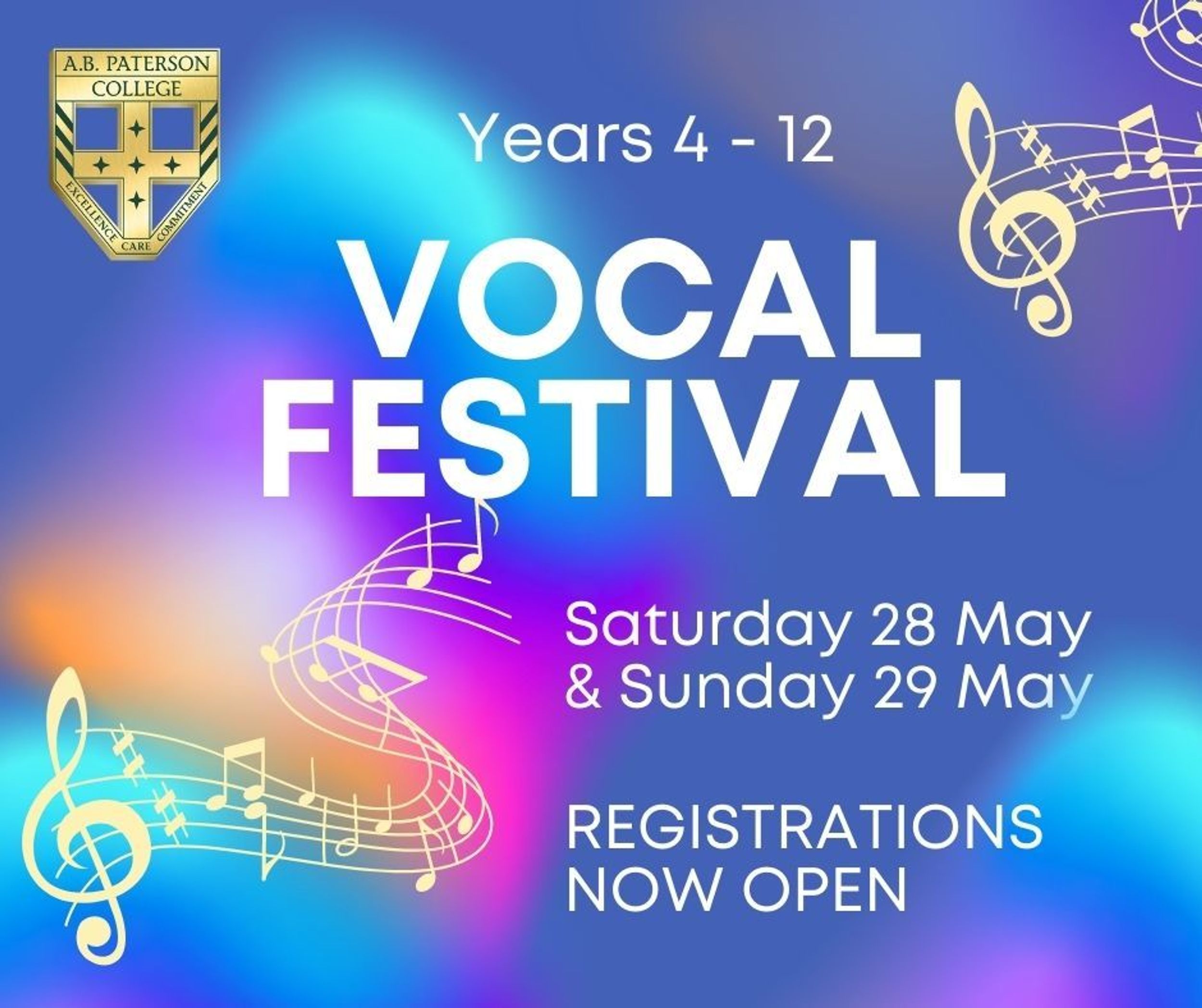 On Saturday 28 May and Sunday 29 May, we will be holding the annual A.B. Paterson College Vocal Festival for Years 4-12 students.