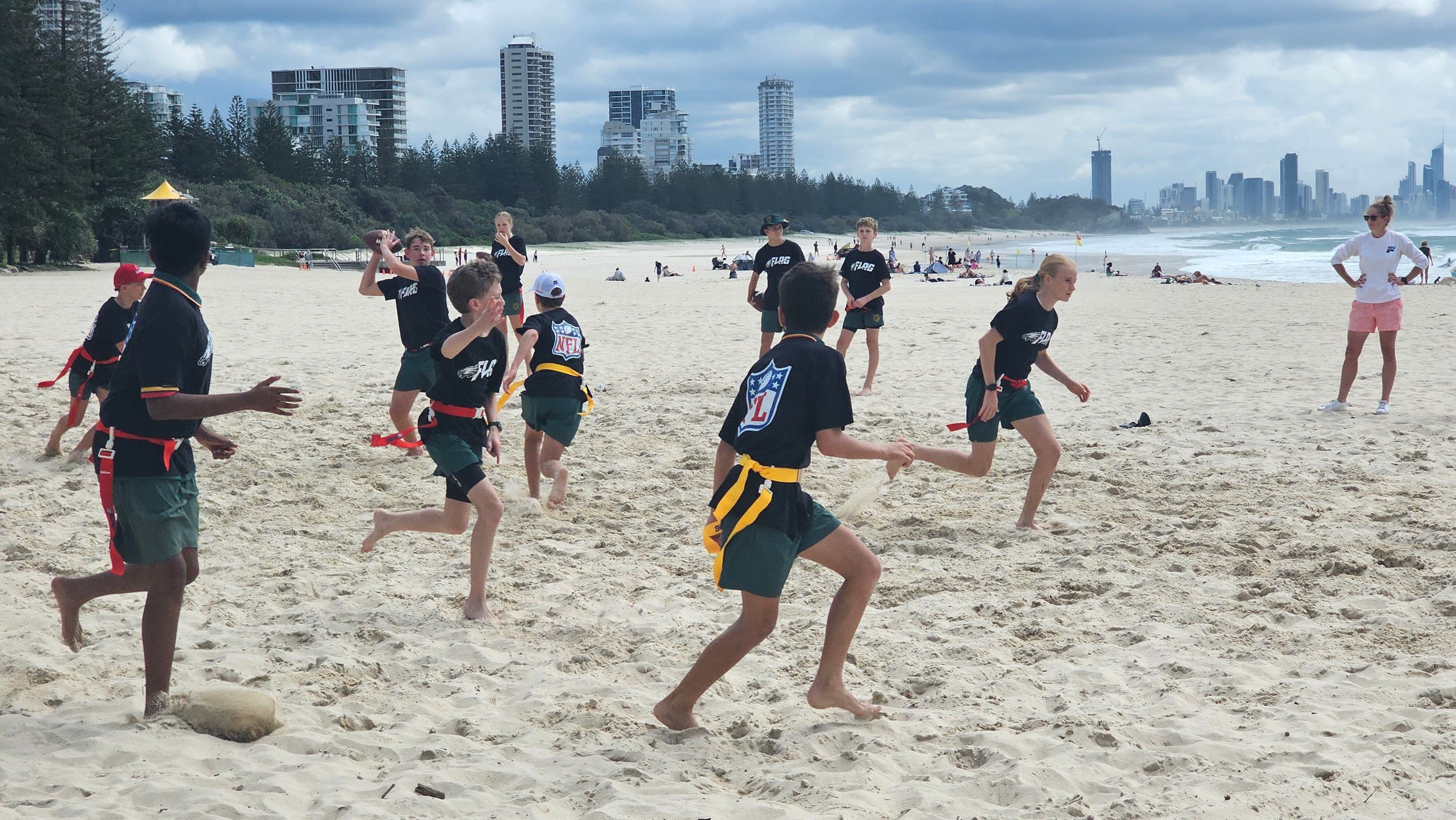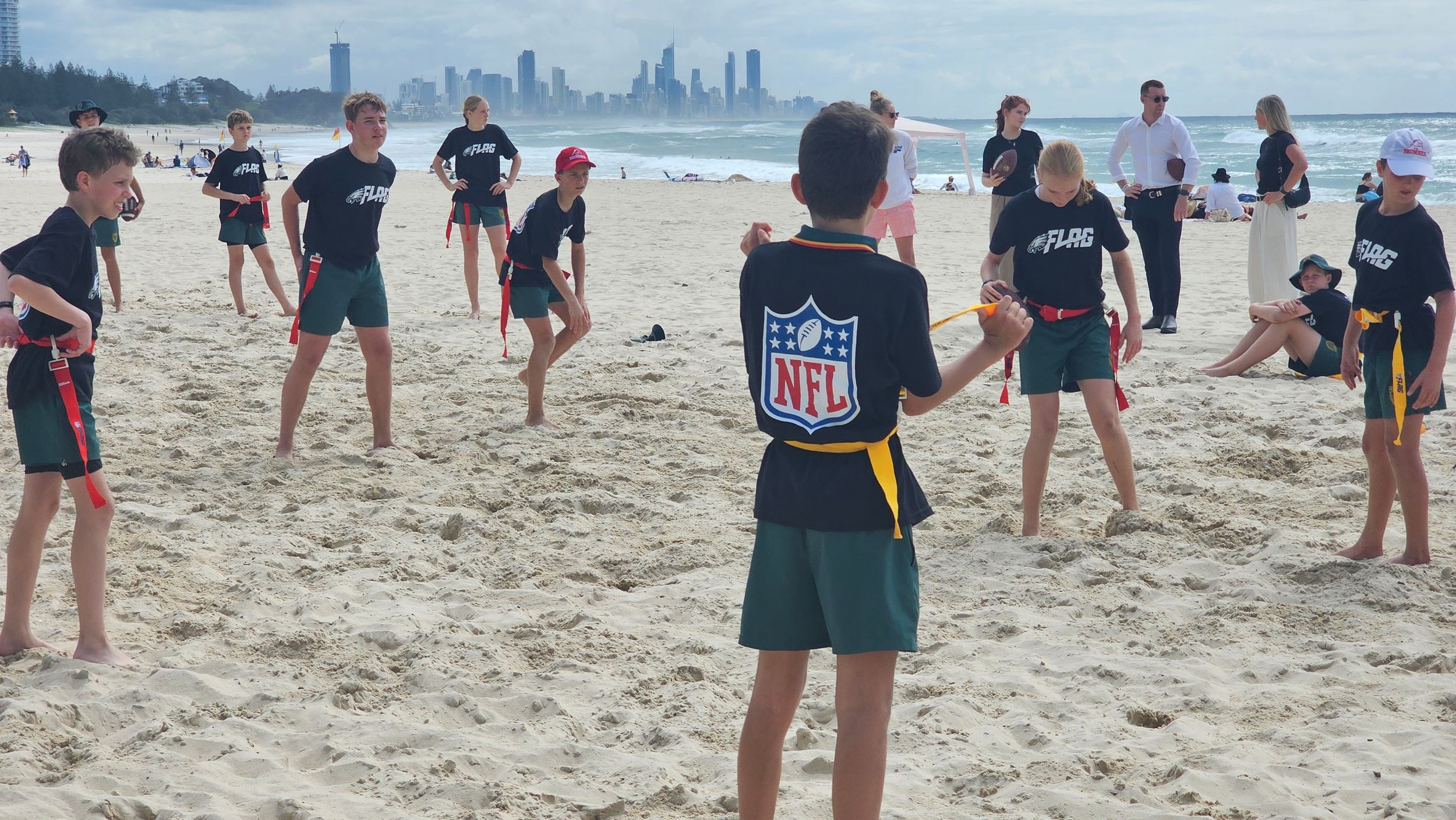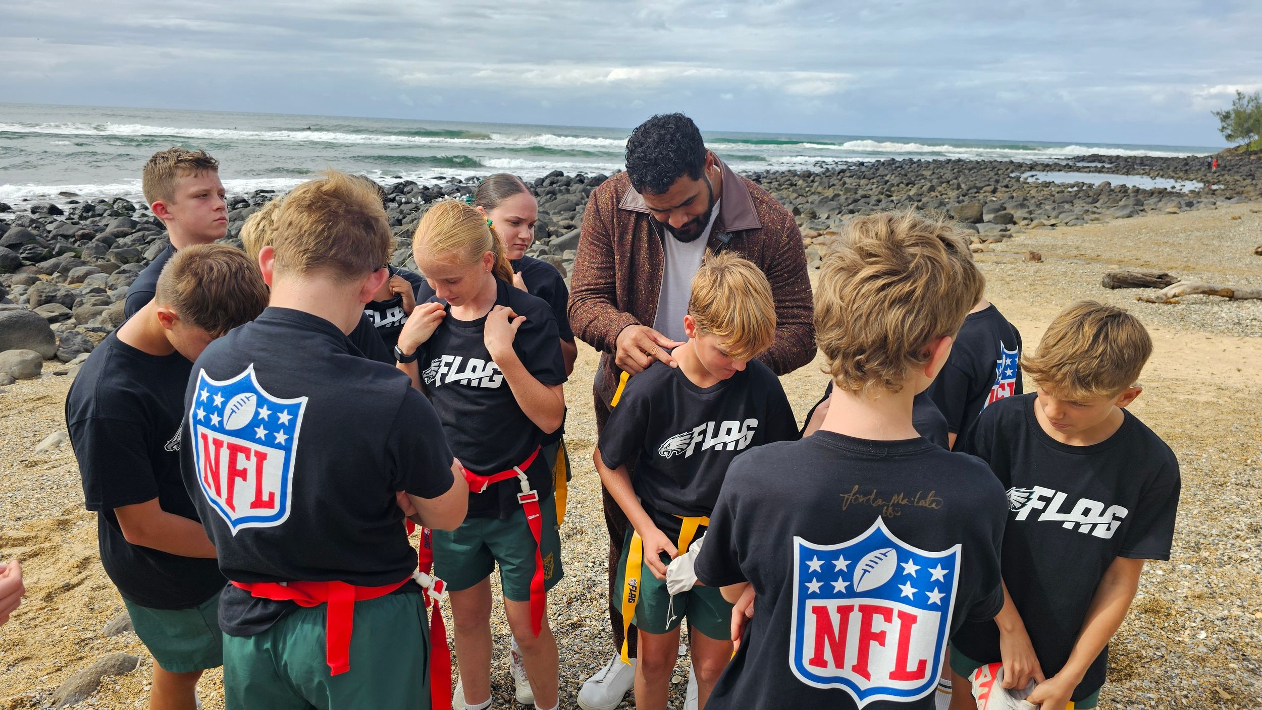Students had a great time trying out a number of NFL drills at the launch of the NFL Academy on Friday before some NFL Tag on the beach at Burleigh for the Philadelphia Eagles draft announcement.