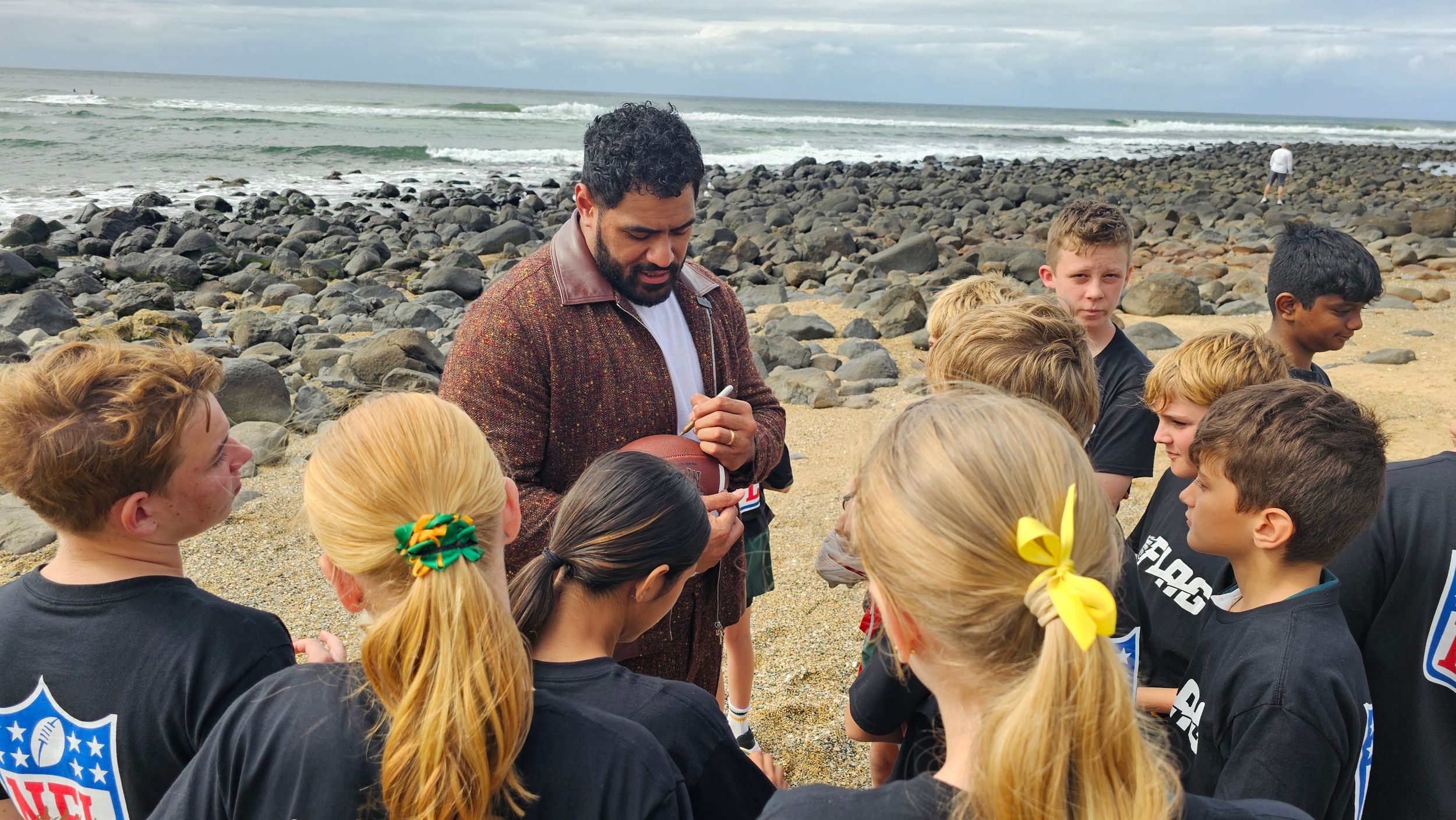 Jordan Mailata being incredibly generous with his time, signing shirts, balls and anything else the students could get hold of to be signed!
