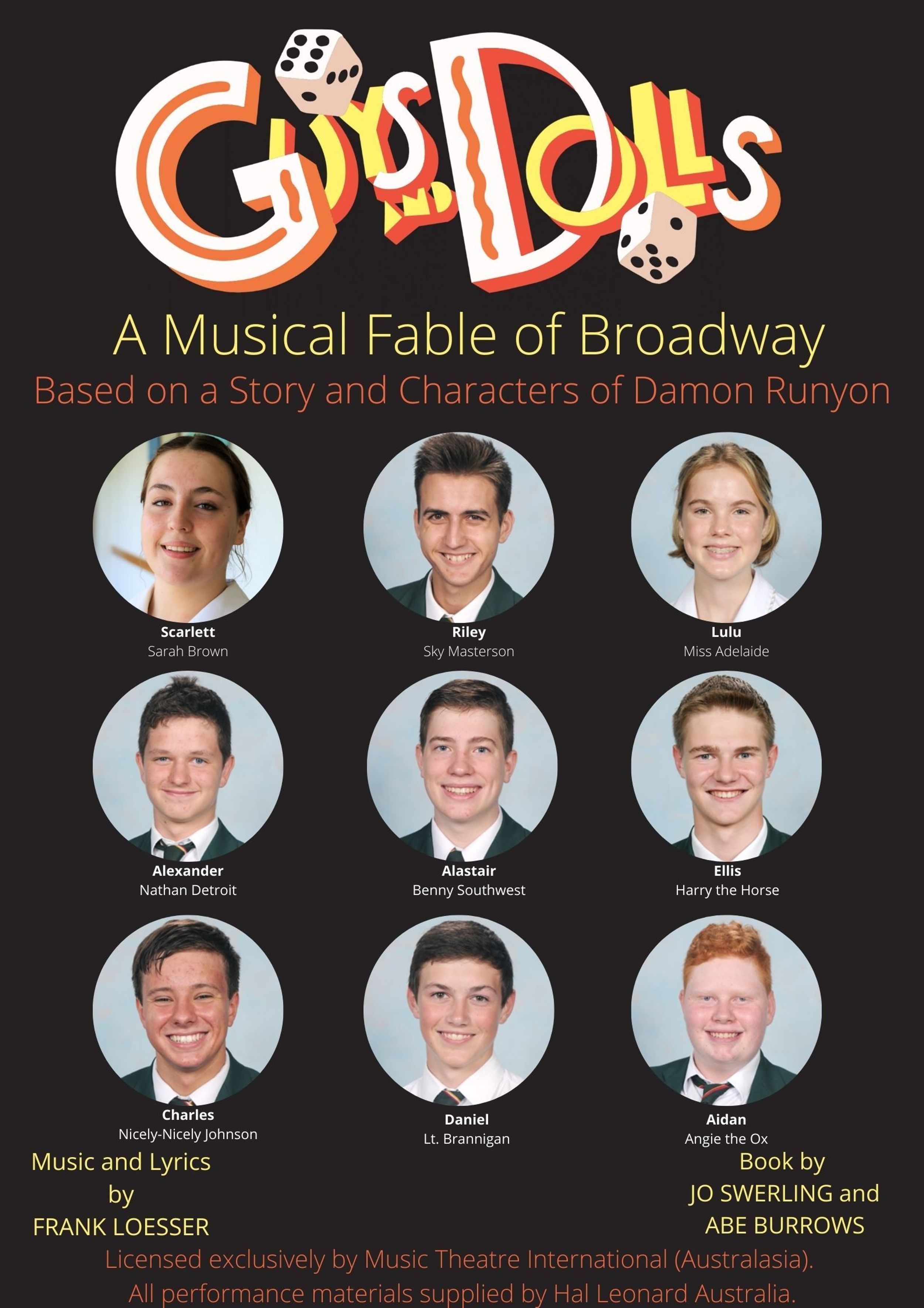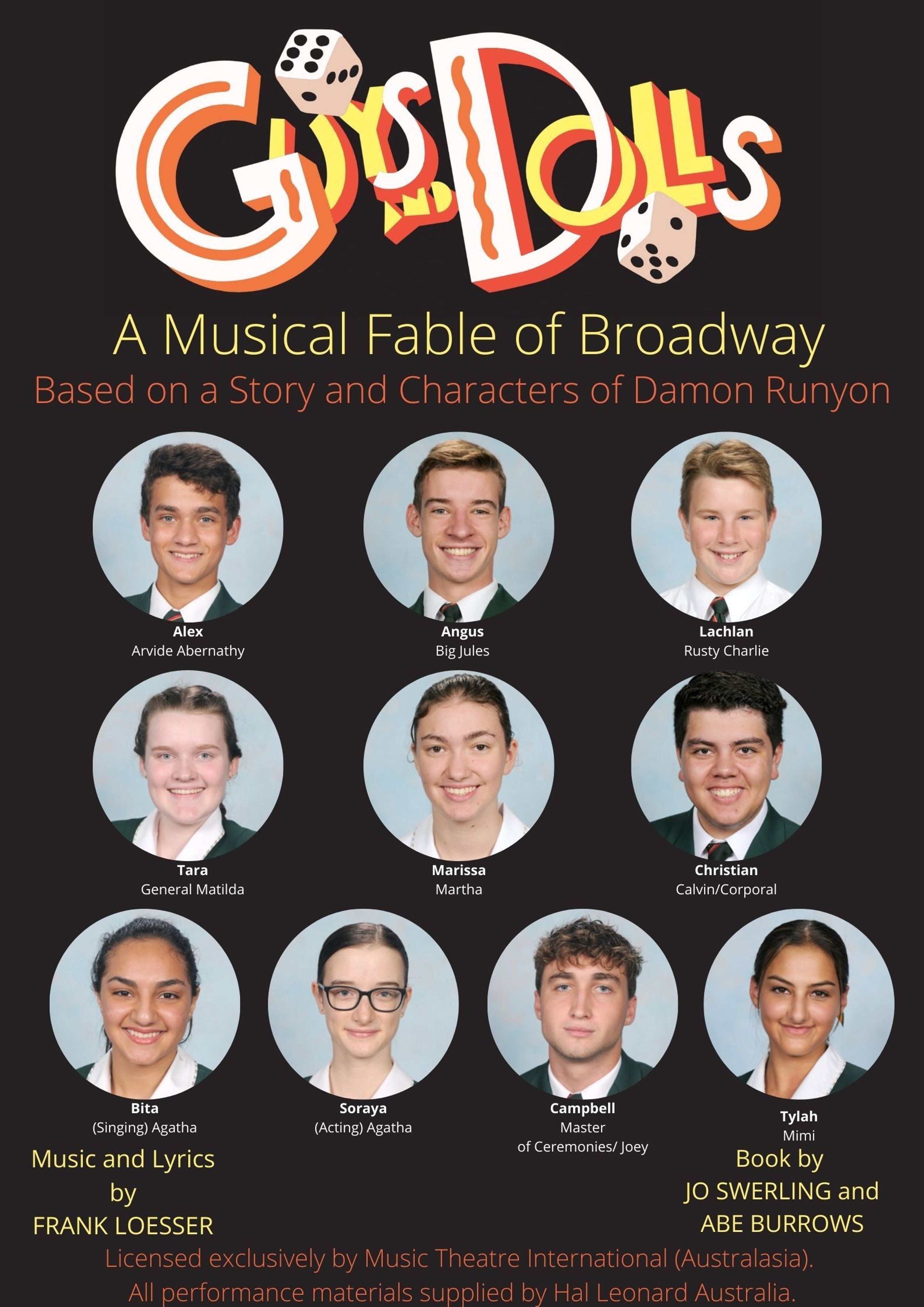 Sarah Brown - Scarlett Smith Sky Masterson - Riley Collier Miss Adelaide - Lulu Mathers Nathan Detroit - Alexander Roberts Benny Southwest - Alastair McNamara Harry the Horse - Ellis Williams Nicely-Nicely Johnson - Charles Morris Arvide Abernathy - Alex Davies Angie the Ox - Aidan McElory Lt. Brannigan - Daniel Teren Rusty Charlie - Lachlan Kelly Big Jules - Angus Rogers General Matilda - Tara Lee Martha - Marissa Dirkx Calvin/Corporal - Christian Smith (Singing) Agatha - Bita Shahidzadeh (Acting) Agatha - Soraya Comley Master of Ceremonies/Joey - Campbell Rousley Mimi - Tylah Barakat Dancers