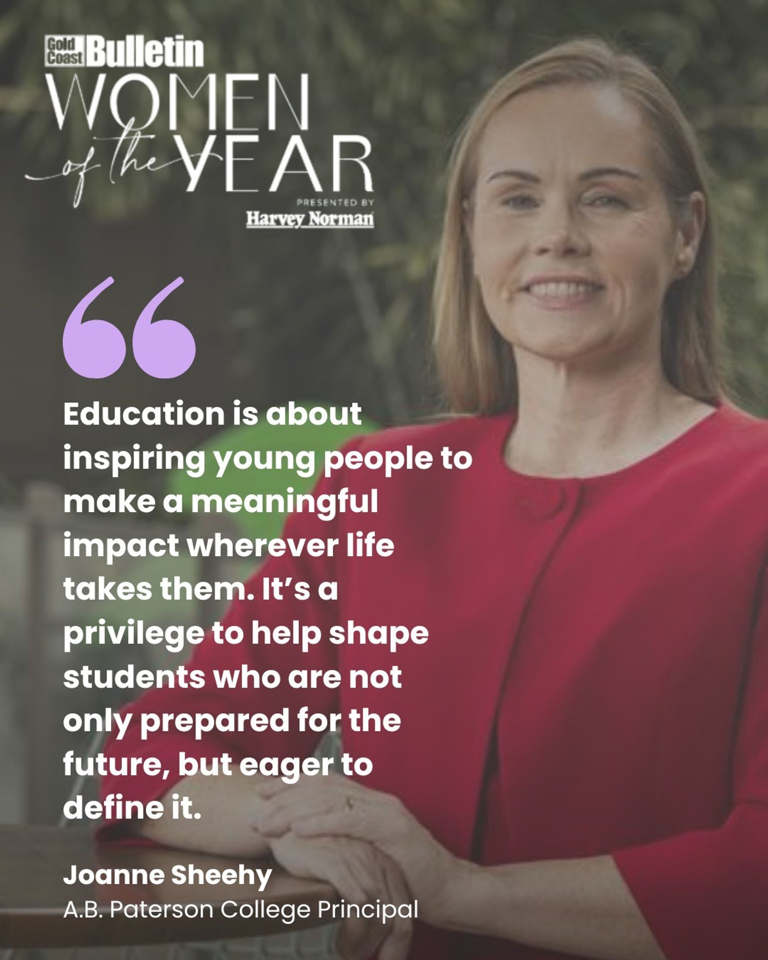 Our very own Principal, Joanne Sheehy, is the only Gold Coast primary or secondary school educator named as a finalist in this year's Gold Coast Bulletin Women of the Year Awards!